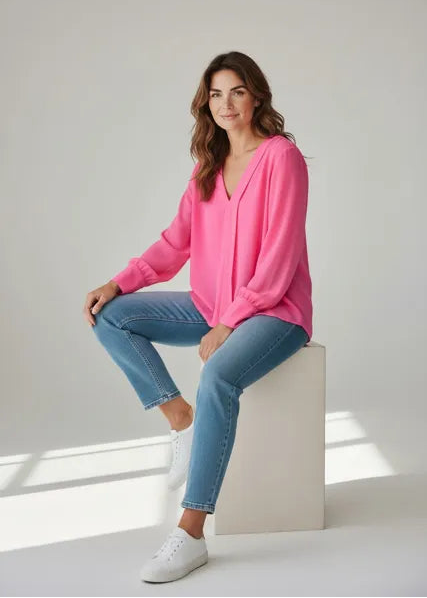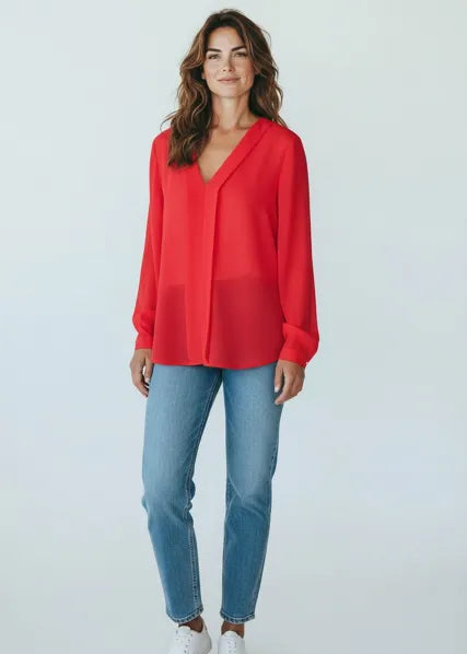 Geef je outfit direct een elegante en frisse uitstraling met deze prachtige V‑hals blouse. De luchtige stof valt soepel langs het lichaam en zorgt voor een vrouwelijke, flatterende look. Dankzij de V‑hals creëert de blouse een mooie, open halslijn die zowel stijlvol als comfortabel is.